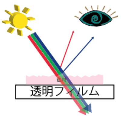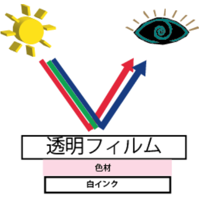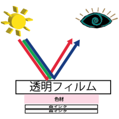 人の眼は、色を光の反射で見ています。クリアファイルは透明素材の為、光を透過していしまいますので、通常印刷ですと、インクが透過して反射率が低くなり、色が見え辛くなります。