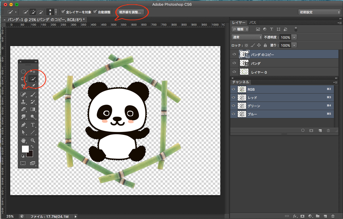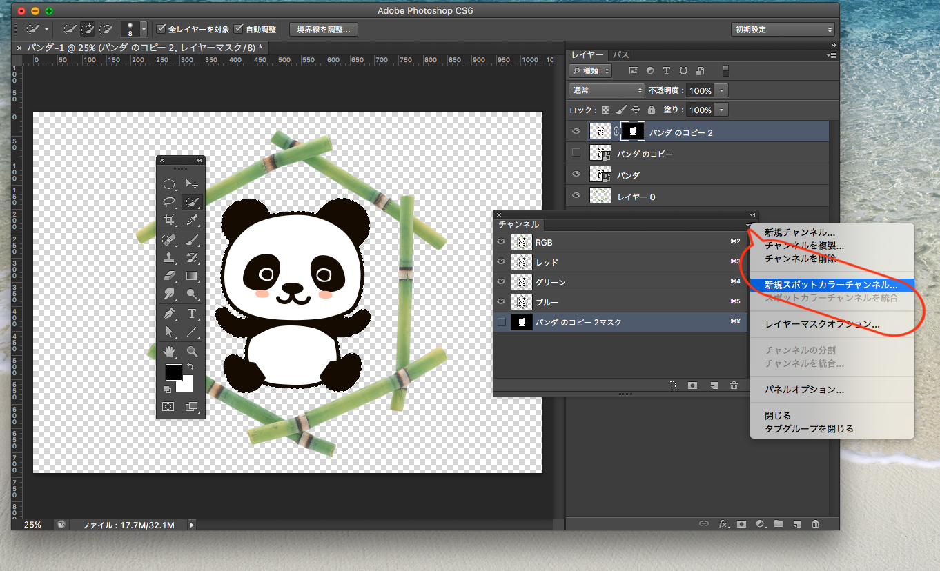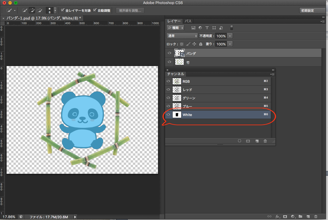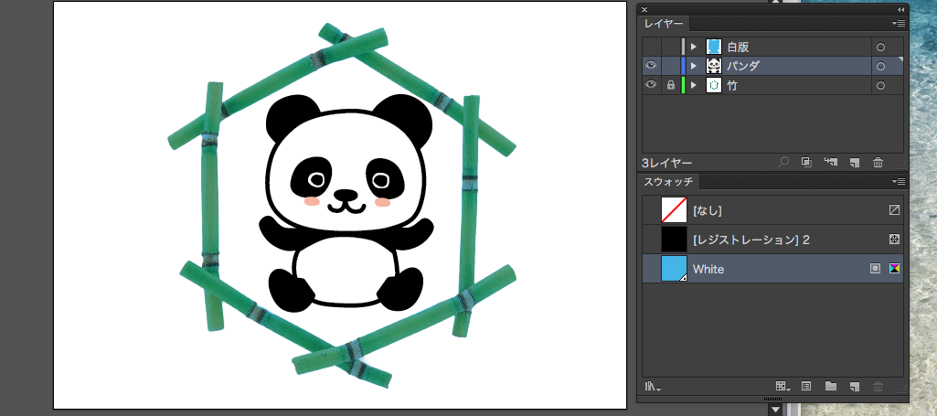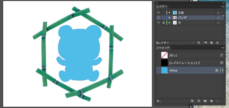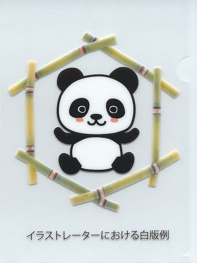 通常のデザインデータを作成します。CMYKでもRGBワークフローでもOK。今回はイラストのパンダの背面に白を引きます