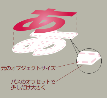 余程クライアントからの要望が無い限りはパスのオフセットで 0.5mm 程度ワイドにしておきましょう。あまりワイドにし過ぎると白フチで巻いた様になってしまいますが、これをしないと逆にエッジが目立ってしまったり、デザインを崩してしまう場合が有ります。