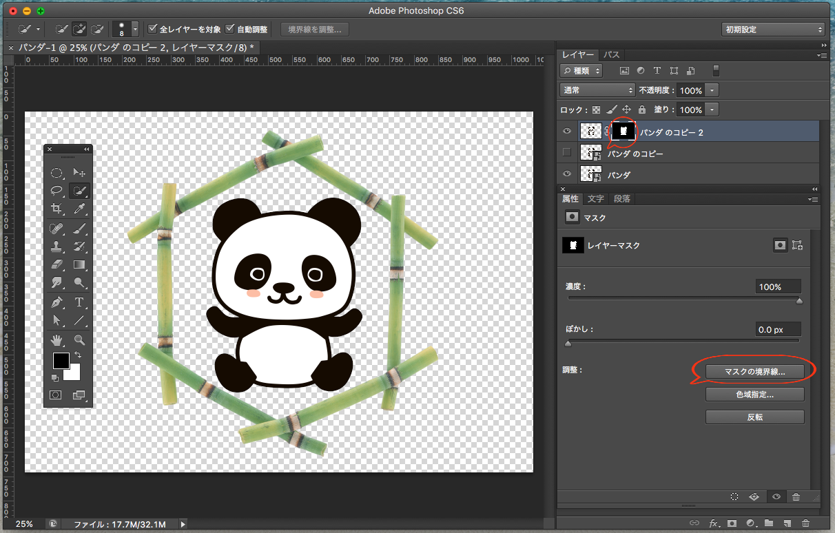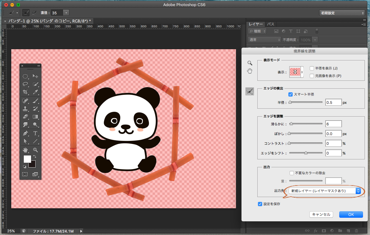 「属性」の「マスクの境界線」を選択します。再度、調整が終わったら『出力先』を「選択範囲」にして『OK』をクリックします。